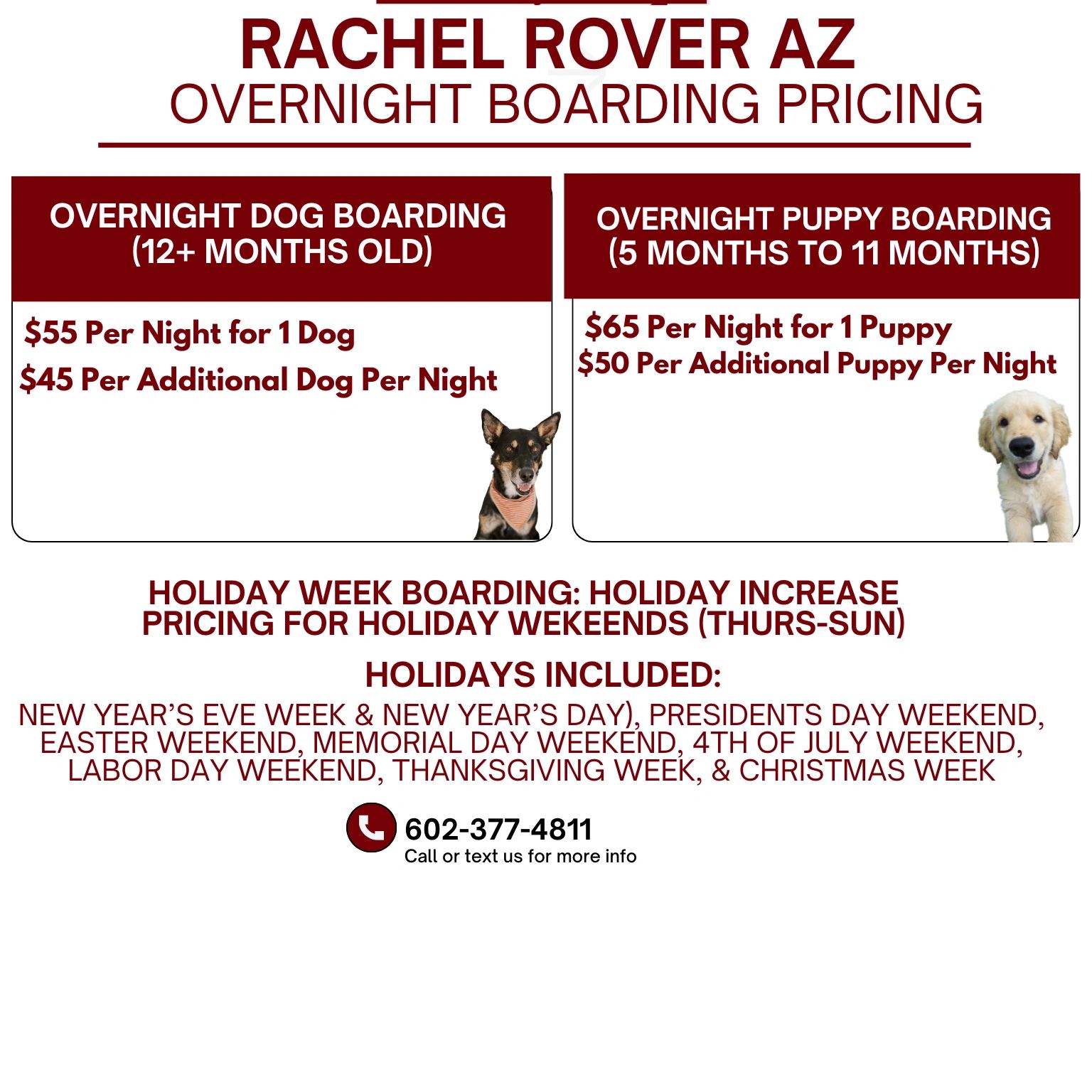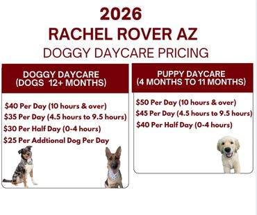 I don't watch non-neutered male dogs past 9 months old. After 9 months, they MUST be neutered to stay at Rachel Rover AZ. For daycare, they can come play only for the day, until 1 years old if they are not not neutered. After that all males must be neutered. No females in heat are allowed to stay or play here.
